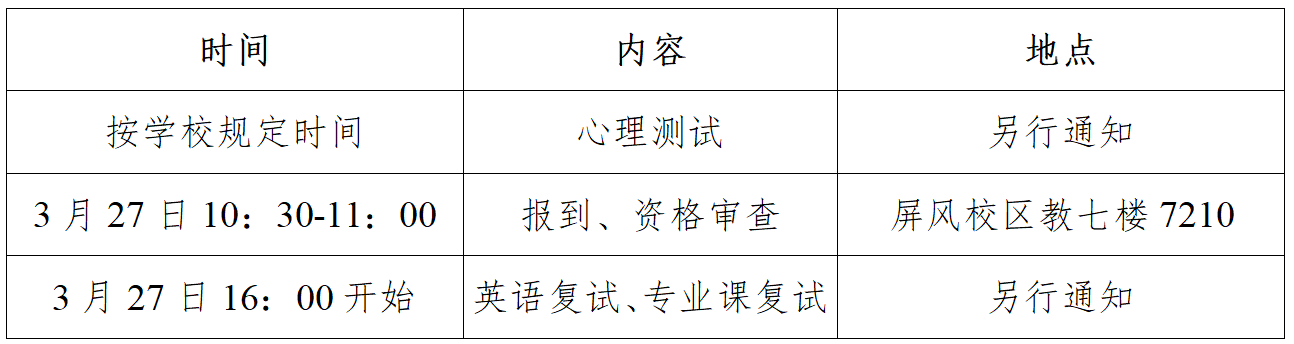 (三)复试方式:现场复试,一般每位考生面试时间不少于20分钟,考生明确表示已作答完毕的可提前结束。