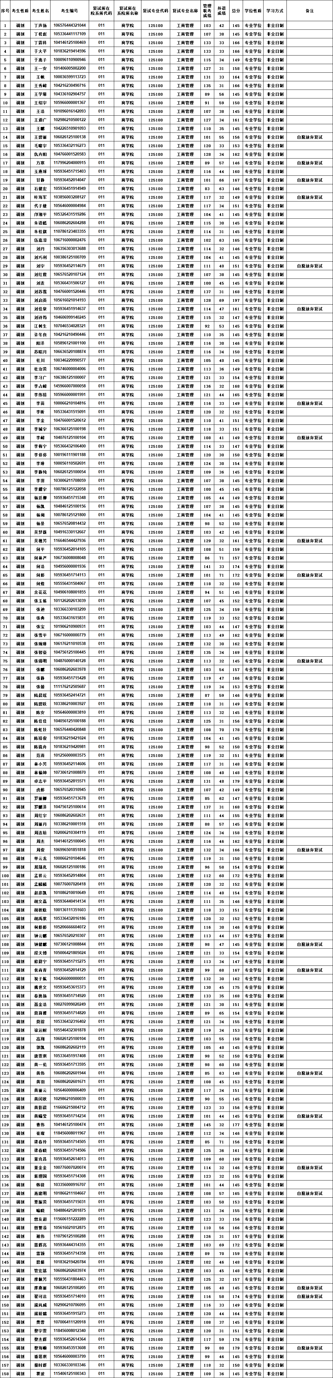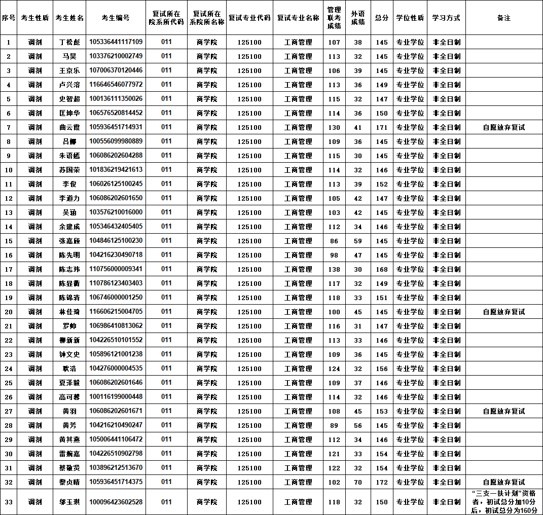 工商管理专业2026年调剂考生复试名单(全日制)(按考生姓氏笔画顺序)