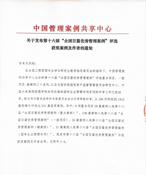 “全国百篇优秀管理案例”是全国工商管理案例领域的最高奖项,并先后纳入教育部2012年第三轮学科评估指标体系(C5指标)和2016年工商管理硕士专业学位水平评估指标体系(C1指标)。第十六届全国百优案例评选共收到来自全国高校的1812篇投稿,经过两轮评审,最终,8项重点项目29篇案例入选重点案例,136篇案例入选一般项目,35篇案例入选微案例,31篇案例入选国有企业管理专项。