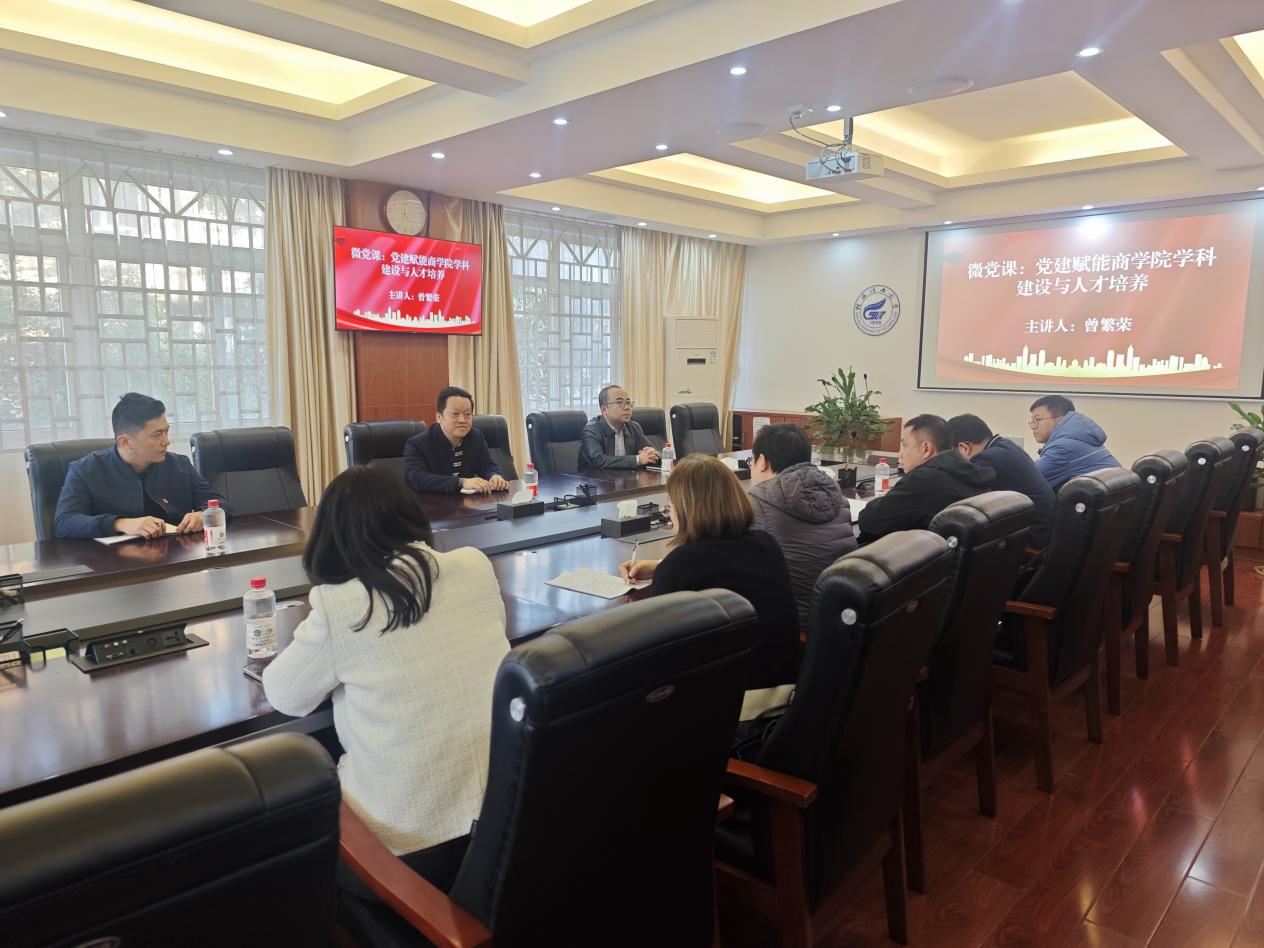 12月19日下午,商学院教工第四党支部在屏风校区7206会议室开展“深学细悟强党性,守正创新促发展”主题党日活动。学校党委常委、副校长曾繁荣到会指导并讲授微党课。学院党委副书记、院长李雷,副院长廖帅以支部党员身份参加活动。活动由支部书记何里文主持。活动中,何里文传达学习了学校第四次党代会精神,重点围绕大会主题、历史性成就、“六个必须始终坚持”的宝贵经验、发展新形势新使命、“三步走”战略目标、今后五年中...